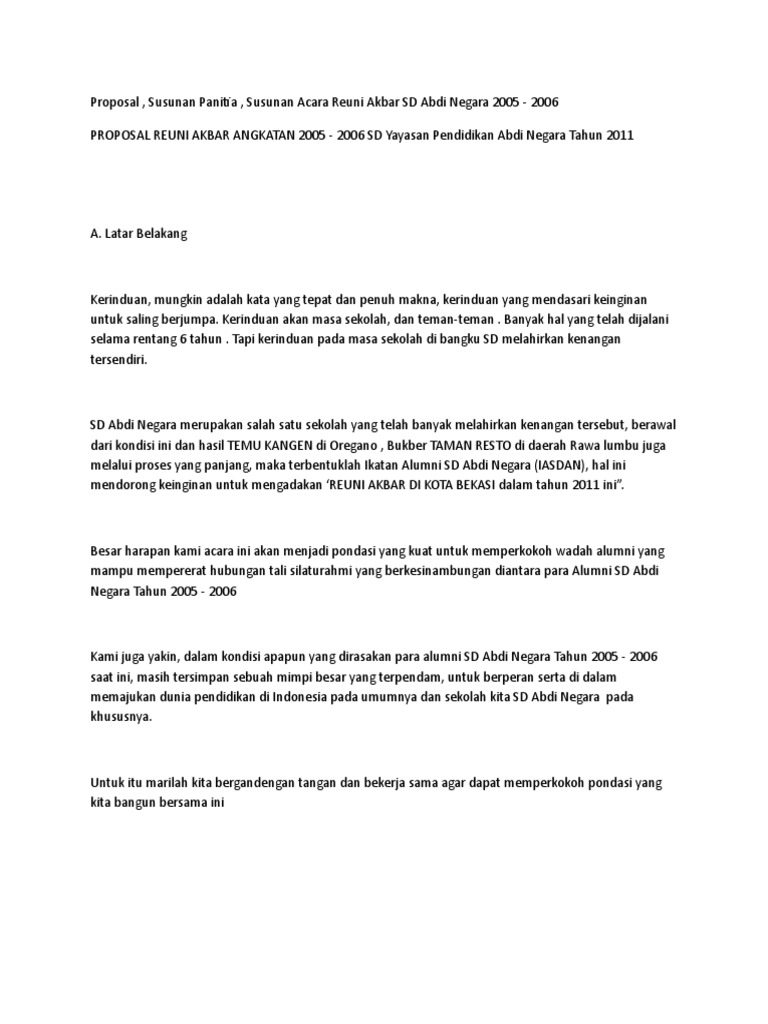 Contoh Proposal Reuni Smp Ilmusosial Id from imgv2-2-f.scribdassets.com Kegiatan sekolah, usaha, pengajuan dana, kewirausahaan, pembangunan masjid, seminar dll. Suatu sekolah mungkin saja mengadakan berbagai kegiatan tertentu dan ingin menjalin kerjasama dengan berbagai pihak sponsorship. Demikian proposal ini kami buat sebagai sebuah acuan bersama dalam menyelenggarakan kegiatan seperti ini. Ini adalah gambaran kegiatan pelaksanaan reuni 1 dekade dari kita untuk kita. Komite sekolah kepala sekolah ketua ( nama komite yayasan.) (nama kepala sekolah) mengetahui : Semoga acara ini dapat terlaksana. Pembuatan contoh proposal biasanya ditujukan kepada suatu perusahaan/instansi tertentu. Home › informasi › program › proposal.
